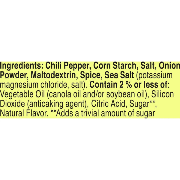 Chili Pepper, Corn Starch, Salt, Onion Powder, Maltodextrin, Spice, Sea Salt (Potassium Magnesium Chloride, Salt), Contain 2 % Or Less Of: Vegetable Oil (Canola Oil And/Or Soybean Oil), Silicon Dioxide (Anticaking Agent), Citric Acid, Sugar (Adds A Trivial Amount Of Sugar), Natural Flavor.