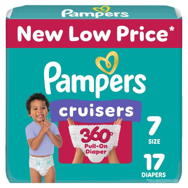 Pampers Cruisers 360 pull-on baby diapers provide our best fit and protection for your active baby at any stage. Unlike ordinary disposable diapers that gap in the back, Pampers Cruisers 360 diapers stretch comfortably around your baby's waist and adapt to their every move for a flexible, Babyproof and gap-free fit that is up to 100% leakproof. Plus, they feature our Dual Leak-Guard Barriers that gently seal around your baby's legs, where leaks happen most. And forget fiddling with ordinary diaper tapes! Pampers Cruisers 360 has a 360-degree stretchy waistband designed to quickly and easily pull up onto your wiggly baby. Easy for you to pull on and take off but difficult to remove for your baby. And when a diaper change is complete, we've made disposal simple. All you need to do is RIP the Easy-Tear Side, ROLL up the diaper, then secure it with the disposal tape that comes attached to the back. Simple as that. Also, to keep your baby's delicate skin healthy, Pampers Cruisers 360 delivers breathable dryness, pulling out wetness and locking it away from skin using our exclusive LockAway Channels. Plus, Cruisers 360 is hypoallergenic and completely free of elemental chlorine bleaching, parabens and latex.** * For trusted protection, trust Pampers to help keep your little one happy and comfy on-the-go, the #1 pediatrician recommended brand. **No Natural rubber