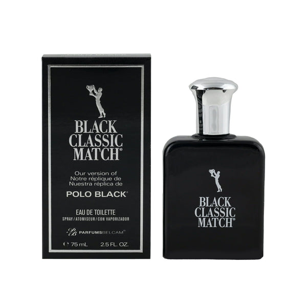 Parfums Belcam Black Classic Match Eau de Toilette Cologne for Men, 2.5 Oz Full Size. Black Classic Match, version of Polo Black* Eau de Toilette Spray for Men, is a fresh woody fragrance blending leafy green notes, sparkling mandarin, sandalwood and patchouli. This version of Polo Black* is a darkly sensuous fragrance, a long wearing and affordable alternative to the designer original. Classic Match fragrances are not associated with Polo Black*, which is the trademark of the brand name manufacturer. Black Classic Match, version of Polo Black* for Men, by PB ParfumsBelcam, Eau de Toilette Spray for Men, 2.5 oz.