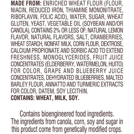 Made From: Enriched Wheat Flour (flour, Niacin, Reduced Iron, Thiamine Mononitrate, Riboflavin, Folic Acid), Water, Sugar, Wheat Gluten, Yeast, Vegetable Oil (soybean And/or Canola), Contains 2% Or Less Of: Natural Lemon Flavor, Natural Flavors, Salt, Cranberries, Wheat Starch, Nonfat Milk, Corn Flour, Dextrose, Calcium Propionate And Sorbic Acid To Extend Freshness, Monoglycerides, Fruit Juice Concentrates (elderberry, Watermelon, Huito) For Color, Grape And Blueberry Juice Concentrates, Dehydrated Blueberries, Malted Barley Flour, Annatto And Turmeric Extracts For Color, Datem, Soy Lecithin.