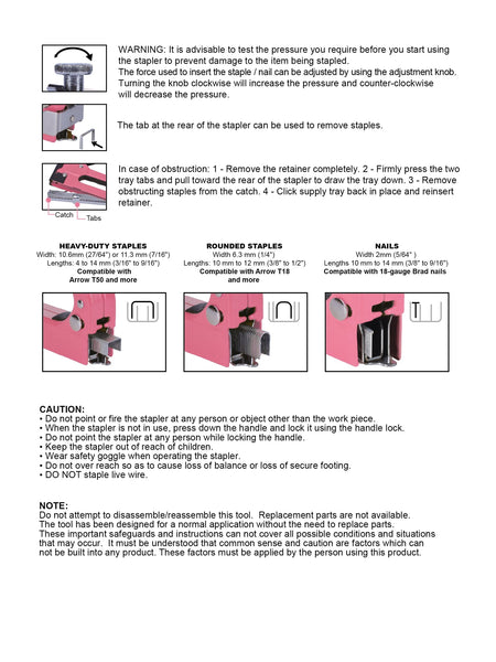 EASY POWER ADJUSTMENT. The adjustment knob allows you to set different pressures depending on how hard or soft the material is that you want to staple. This allows for modulated power for stapling into a variety of materials from soft to hard, and thin to thick, such as fabric, leather, cardboard, wood, etc. Easy jam-clearing for quick removal of stuck staples.