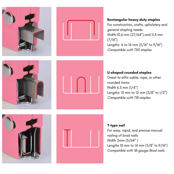 MULTI-FUNCTIONAL STAPLER. Apollo Tools’ all-metal 3-in-1 heavy-duty stapler fits 3 kinds of different staples: rectangular heavy-duty D-type staples (T50 compatible), rounded U- type staples (T18 compatible), and T-type nails (brad nail gauge 18 compatible). The stapler accommodates various lengths of staples, giving you maximum flexibility depending on the thickness of the materials you are working with.