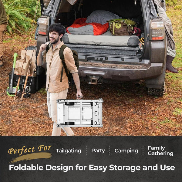 - Easy Folding and Mobility: The portable grill table folds for easy storage and transport. Equipped with 4 sturdy wheels, it rolls smoothly over uneven terrain. Ideal for tailgating, camping and beach parties, making outdoor cooking effortless anywhere.