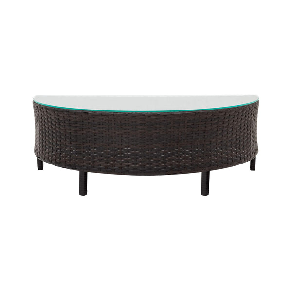 - The half-moon glass-top table radiates sophistication while providing a sturdy surface for accessories or refreshments.
