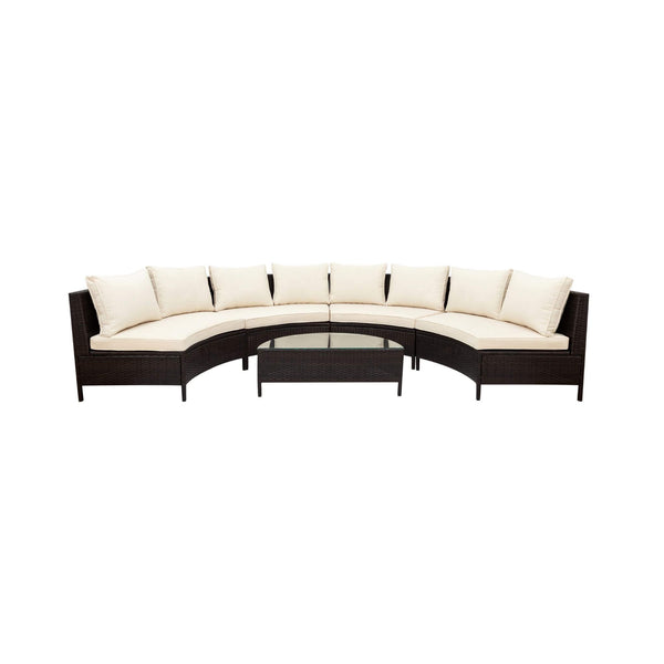This sectional is as adaptable as your lifestyle. Its modular design allows the pieces to be rearranged into countless configurations, from an intimate nook for romantic evenings to a social layout for lively gatherings. With its neutral beige tones and elegant rattan texture, it complements any outdoor aesthetic. This set was made for those who appreciate beauty, simplicity, and the value of multi-purpose design.