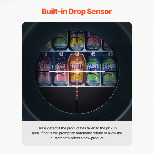 - This vending machine has a drop sensor that ensures products are dispensed properly. If a product isn’t delivered after payment, it automatically refunds the customer, protecting both users and the machine.