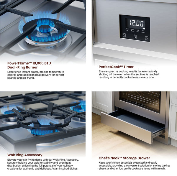 36" Range: Spacious and powerful, ideal for larger families and kitchens, offering ample room and performance for multi-course meals and entertaining.