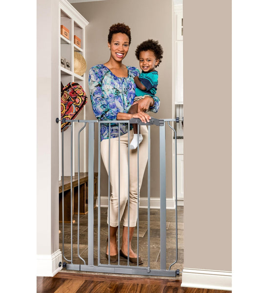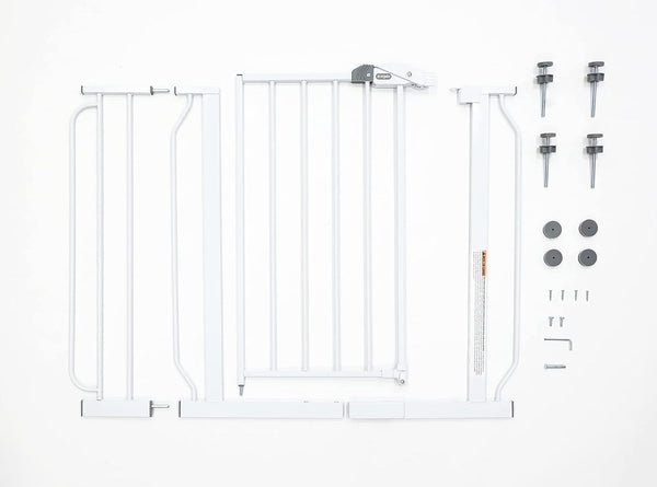 Keep your little explorers safe with the Regalo Easy Step Baby Gate, a reliable and durable safety solution designed for busy families. Crafted from sturdy all-steel construction, this extra-wide safety gate fits openings between 29 and 34 inches and 35 to 38.5 inches, standing 30 inches tall to secure doorways, hallways, and stairways. Installation is a breeze with versatile pressure mount or wall mount options, requiring no drilling for most setups. The gate features a convenient walk-through door with a one-touch safety lock lever, allowing adults to pass easily while keeping children and pets safely contained. Designed specifically for children aged 6 to 24 months, this gate is also perfect for medium to large dogs, making it a versatile barrier for your home. The 2.5-inch spacing between bars ensures safety by preventing little fingers from getting stuck, while the 16-inch wide door allows easy access. Please note: Before installation, the gate may appear bent and a gap may be visible at the handle — this is normal and will be eliminated once properly mounted. Always measure your opening prior to purchase to guarantee the right fit. The gate frame is designed to remain assembled at all times for maximum safety. Included in the package is a 6-inch extension kit, four pressure-mounted spindle rods, and four wall cups with screws to provide a secure and customizable fit for your home. Choose the Regalo Easy Step Baby Gate for a durable, easy-to-use, and trusted safety gate that protects your loved ones.