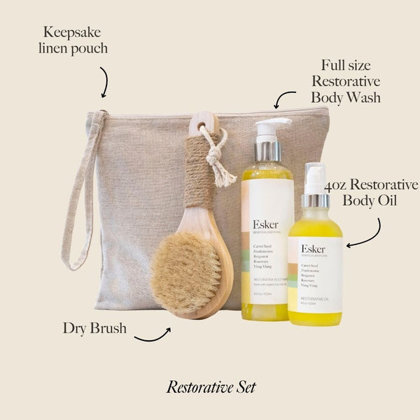 Your Restorative Ritual awaits with our Restorative Body Wash, Restorative Oil, and our Dry Brush delivered to you in an in-house designed, embroidered, reusable linen bag. The Restorative Gift Set makes an ideal gift and is beautifully presented in a gift box featuring an original, hand-painted watercolor wildflower print. The set contains 4 oz Body Oil, 8.5 oz Body Wash, and our Dry Brush with wrapped twine handle.