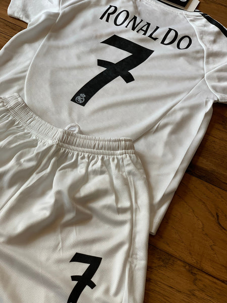 HOT! One of our best sellers hands down. Many records set in this beautiful Kids Jersey! Allow your KIDDO peak performance while putting this jersey on his back, an instant finger snap and boom faster, kicks harder, and plays better! In 99% of our customers :). White Ronaldo Kids Soccer Jersey Real Madrid Youth Toddler Sizes. Football Youth Toddler Football Shirt and Shorts matching set. Toddler Youth Tshirt Awesome Youth Soccer Jersey and shorts set of 2. Size 2T, 3T, 4T, 5T, 18, 20, 22, 24, 26, 28, 30. All in stock ships within 12 hours from order time. We ship from Missouri. All soccer jerseys are brand new and never tried on. Amazing Screen Printing & Embroidery.
