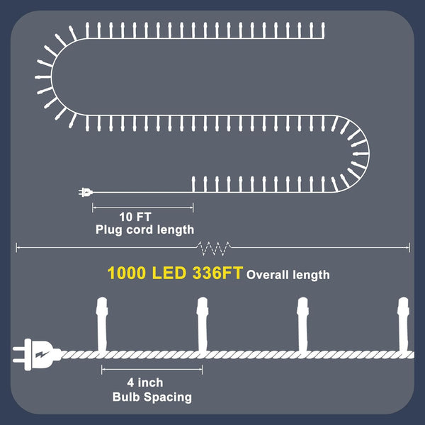 - 【Dark green cable Christmas Tree Light】Perfectly hiding on gardens, plants,and home decoration; 1000pcs warm white LEDs up to 336ft/103m total length with 10ft/3m leading wire, space between each LED: 4 inch/10cm.