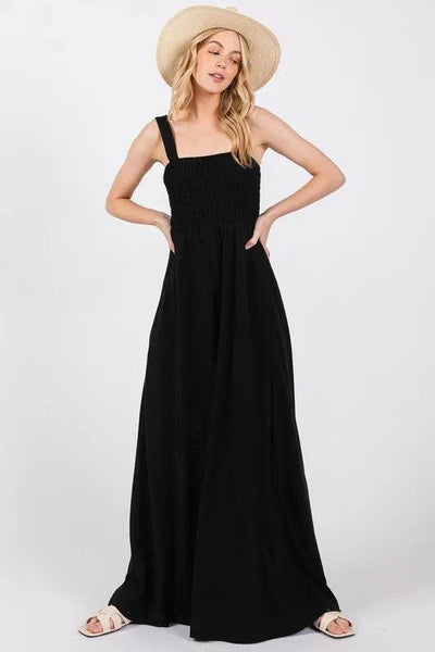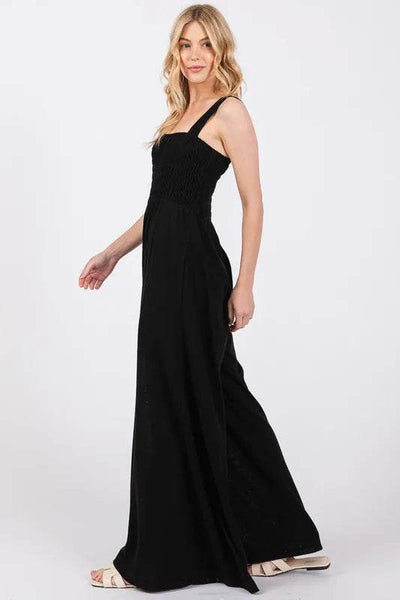 A smocked flowy wide leg jumpsuit is a fashionable and comfortable one-piece outfit. The smocked bodice offers a stretchy and fitted silhouette, while the flowy wide legs provide a relaxed and breezy feel. This jumpsuit is perfect for a stylish and effortless look, ideal for various occasions from casual outings to semi-formal events.