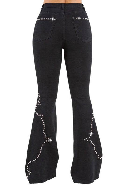 Say hello to the Santa Fe Bell Bottom Jean! These jeans have front and back pockets, including a classic front coin pocket. The front button and zipper closure keeps everything secure. Made from a premium stretch fabric and dyed in our very own dye house in Los Angeles. The front and back also have stylish silver stud details, carefully hand-pierced one by one in our own factory. And don't forget the frayed hem for an added touch. Cut, sewn, dyed, and packed right here in the USA! #ProudlyMadeInUSA