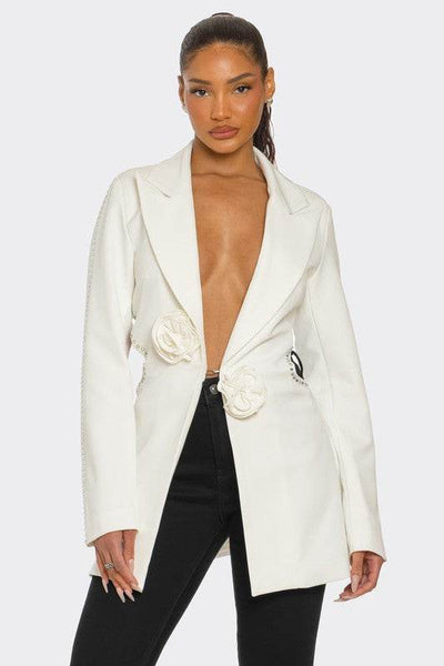 A bold statement piece with a touch of romance, this structured white blazer features delicate floral appliques and crystal embellishments for a luxe finish. The deep V-cut front makes it a sultry yet sophisticated addition to your wardrobe, perfect for layering over sleek ensembles.