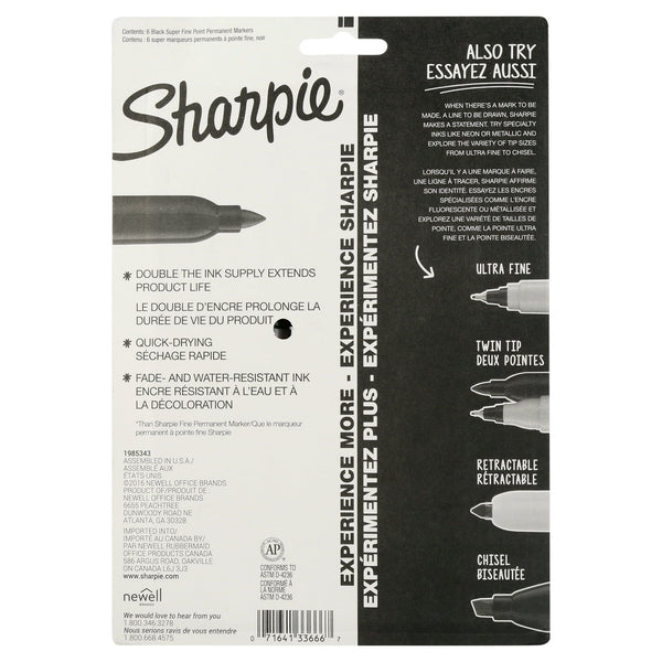 With a super-large ink supply, Sharpie Super Fine Point Markers let you express yourself to your heart's content. Bold to the max and permanent to the core, Sharpie permanent markers inspire you to transform ordinary surfaces into passionately creative statements. Made to write practically everywhere, vivid Sharpie markers eliminate dull and boring. The original permanent marker, Sharpie has iconic ink that dries quickly and resists both water and fading. While pale imitations wither away, Sharpie markers make creations that endure. Featuring a bold fine point built for jaw-dropping marks, Sharpie Super Fine Point Permanent Markers ignite courageous self-expression.