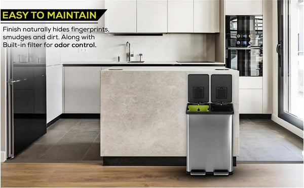 With the hands-free operation of our trash can and recycle bin combo, you can dispose of your recyclables and regular waste without missing a beat. The step-to-open foot-pedal of this garbage can ensures a touch-free experience and contributes to a hygienic environment, especially during food preparation.