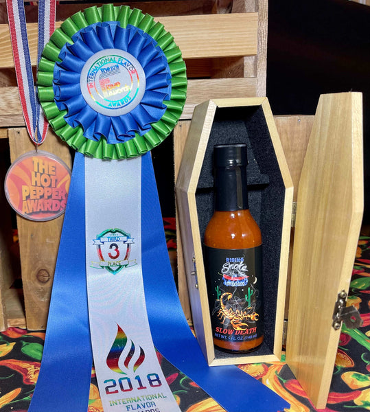 Slow Death is a fiery symphony for true chili enthusiasts. Packed with the bold essence of Trinidad Scorpion peppers and a generous dose of garlic, this sauce delivers an intense, tongue-tingling heat from the get-go. As you savor the initial bright notes, a slow, creeping mouth burn unfolds, leaving a lingering warmth that's sure to satisfy the heat-seeking palate. With a carefully crafted blend of ingredients, Slow Death is a flavor-packed adventure for those who crave the perfect balance of spice and smokiness.
