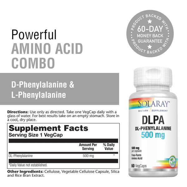 Introducing SOLARAY DL-Phenylalanine, the perfect blend for those days when your mood needs a little more sunshine and your energy levels are as flat as a pancake. This 50-50 blend of essential amino acids is designed to support your nervous system, supports daily wellness, and give your energy the lift it deserves. Each vegcap is packed with 500mg of DL-Phenylalanine, a dynamic duo of amino acids that could make even the most stoic of nerves do a happy dance. With 60 vegcaps in each bottle, you'll have enough to keep you smiling and energized through the month. Because, darling, life’s too short to be anything but fabulous!