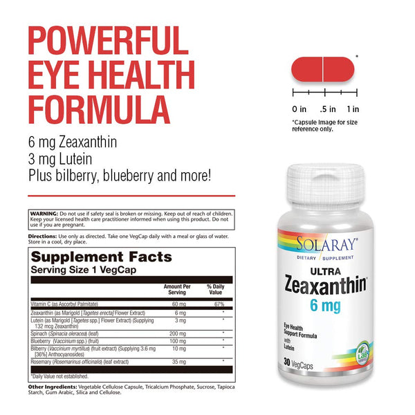 SOLARAY Ultra Zeaxanthin 6 mg - Because your eyes deserve the red carpet treatment! This eye health and macular support formula is the star-studded cast your peepers have been waiting for. With a leading role played by 6 mg of Zeaxanthin, this formula is joined by the dynamic duo of Lutein and Bilberry, plus a cameo from Blueberry. Together, they work to support your vision and keep your eyes feeling fresh and fabulous.