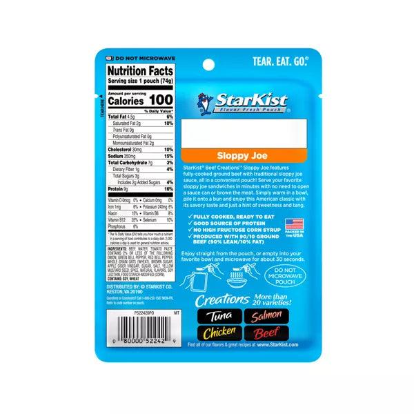 StarKist® Beef Creations™ Sloppy Joe features fully-cooked ground beef with traditional sloppy joe sauce, all in a convenient Pouch! This appetizing combination of 90/10 lean ground beef mixed with onion, bell peppers and tomato sauce is an American savory classic.