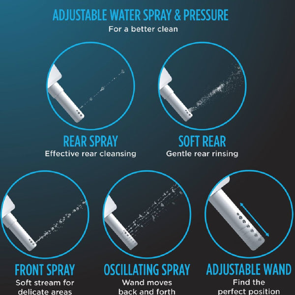 - C5 bidet seat offers adjustable temperature and pressure settings, including rear and front cleanse options with oscillating or pulsating streams, all controlled via a slim, wireless remote.