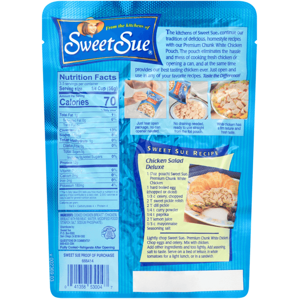 Sweet Sue Premium Chicken Breast is premium, high-quality ready-to-eat chicken breast will satisfy you when you want a tasty and healthy snack, lunch or dinner and is 98% fat free. This Sweet Sue chicken breast is packaged in an easy open pouch and ready-to-eat or a perfect addition to salads, casseroles, soups, or any family recipe. You can always count on delicious, home-style recipes from the kitchens of Sweet Sue. Our original recipes bring tasty, home-style goodness