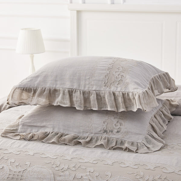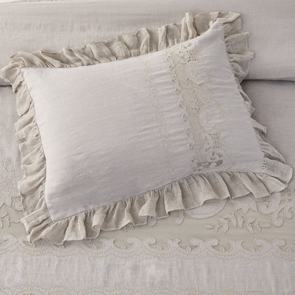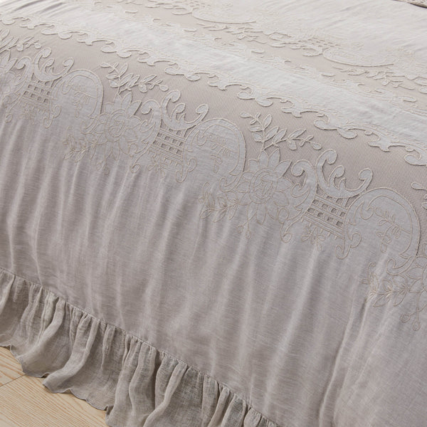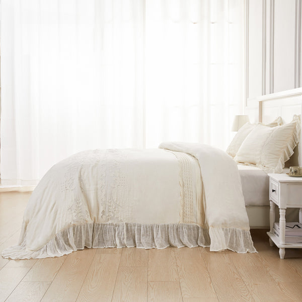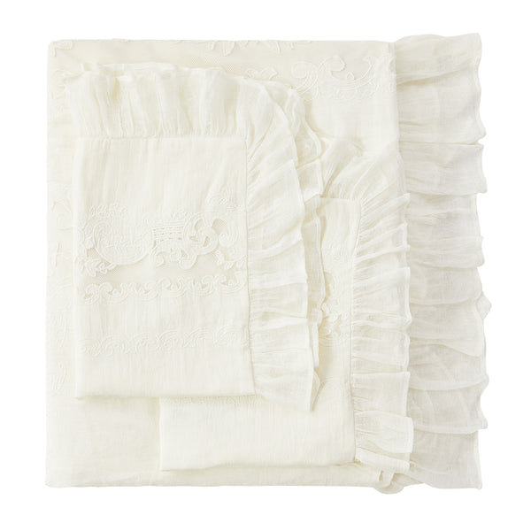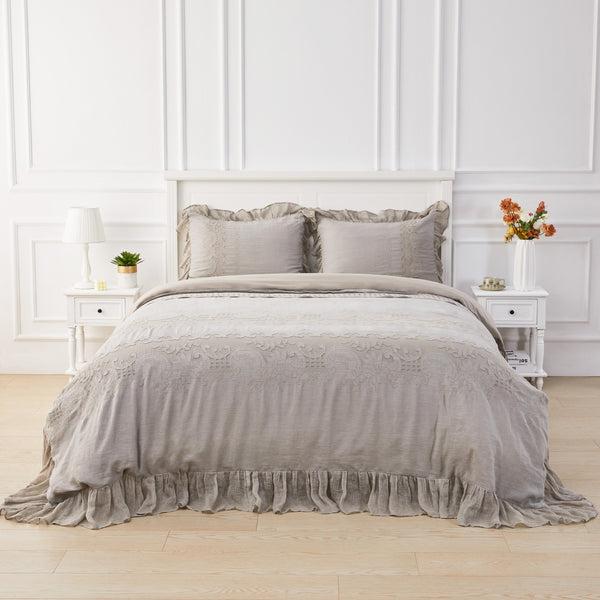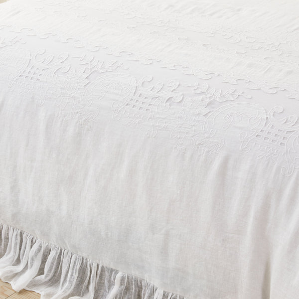 Our Tabitha Linen duvet cover set is casual elegance at its finest. Handcrafted with a linen applique overlay, crochet and pleat detailing, and a voile ruffle border, this duvet set is simply incredible. Linen is breathable, durable and softens with every wash.
