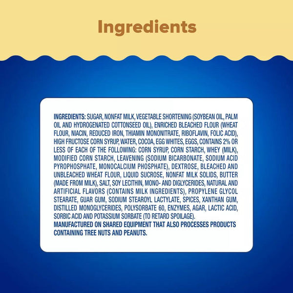 Sugar, Water, Vegetable Shortening (Soybean Oil, Palm Oil, And Hydrogenated Cottonseed Oil), Enriched Bleached Flour (Wheat Flour, Niacin, Reduced Iron, Thiamine Mononitrate, Riboflavin, Folic Acid), Nonfat Milk, High Fructose Corn Syrup, Cocoa, Egg Whites, Eggs, Contains 2% Or Less Of Each Of The Following: Corn Syrup, Modified Corn Starch, Whey (Milk), Corn Starch, Dextrose, Liquid Sucrose, Baking Soda, Sodium Acid Pyrophosphate, Mono- And Diglycerides, Salt, Butter (Made From Milk), Natural And Artificial Flavors (Contains Milk Ingredients), Soy Lecithin, Xanthan Gum, Distilled Monoglycerides, Polysorbate 60, Monocalcium Phosphate, Calcium Sulfate, Agar, Nutmeg, Lactic Acid, Cinnamon, Sorbic Acid And Potassium Sorbate (To Retard Spoilage)