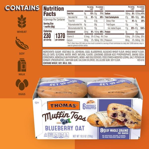 - Thomas's Blueberry Oat Muffin Tops contain 8g of whole grains per serving and are made with no high fructose corn syrup