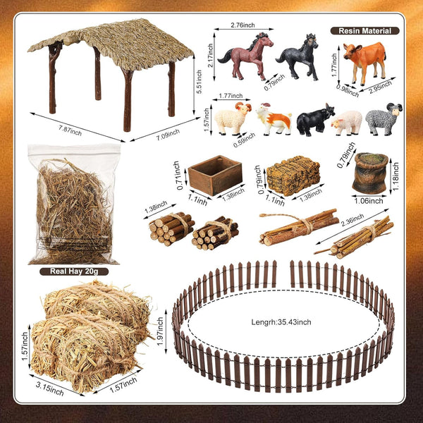 - Realistic Nativity Scene Set: this complete Christmas nativity set includes a 6 inches tall stable, 35 inches long wooden fence, 8 miniature farm animals (including cows, horses, and sheep), 2 mini bundles of firewood, 2 stacked hay bales, 20g of loose dried hay straw, and 3 rustic farm tools, little yellow cow, all designed to recreate the traditional nativity scene with lifelike detail