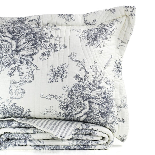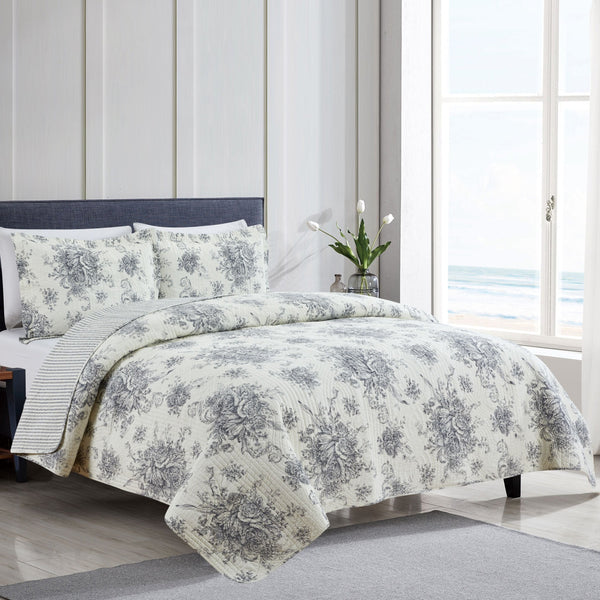 Crafted from a 100% cotton shell with a light cotton fill, this quilt set is warm, beautiful and made to last. Our classic Toile print reverses to Bamboo Stripes.