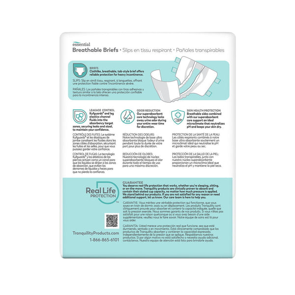 Tranquility® Essential Breathable Briefs are a soft and breathable tab-style product offering secure protection where you need it. These briefs feature breathable side panels and refastenable tabs for a comfortable fit. Kufguards® channel and lock in fluid to keep you dry. Recommended for individuals with heavy incontinence. Latex-free.