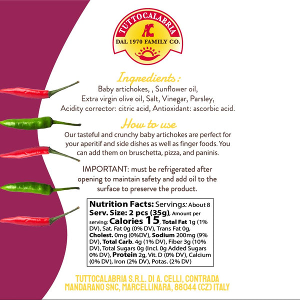 - Enjoy TuttoCalabria's Calabrian artichokes as part of a aperitif, add them to a table of appetizers or use them as a finishing touch for enrich your favorite dishes. With these artichoke hearts, bring to your table a piece of the Calabrian culinary tradition, appreciated for its authenticity and generous flavor.