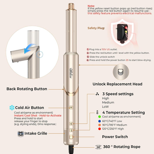 - SAFETY FIRST: UKLISS hot air hair styler features an intelligent NTC temperature control system, a built-in bimetallic thermal switch, and a safety fuse, monitoring the temperature thousands of times per second to ensure optimal temperature control at all times. Simply press and hold the "Snowflake" button for rapid cooling. Multi styler hair tool models also feature an ALCI safety plug to prevent electric shock and come with heat-resistant gloves to protect your hands while styling.