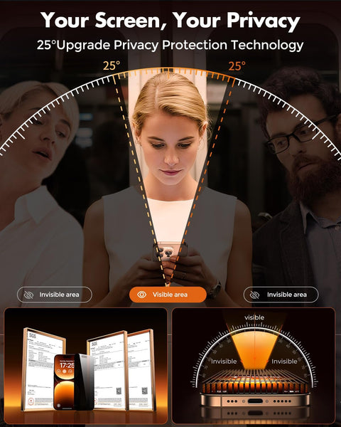 - 【25° Privacy: Screen Stays YOURS】 Block side views in crowded spaces with our 25° privacy angle, ensuring secure browsing during commutes or office hours while providing crystal-clear visuals head-on – designed specifically for your privacy screen iphone 16 Pro Max, keeping your data secure on your iphone 16 Pro Max privacy screen protector