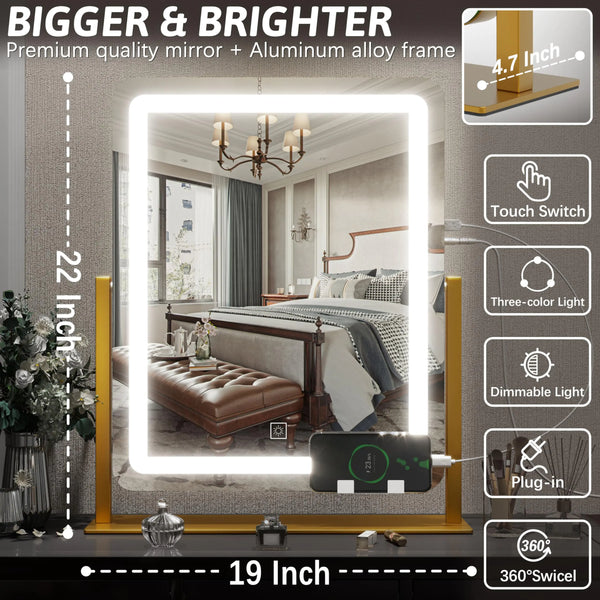 Vanity Mirror with Lights 22 Inch- LED Lighted Makeup Mirror,Large Makeup Mirror with Lights,Touch Screen with 3-Color Lighting,Led Mirror Makeup, Dimmable(Gold)