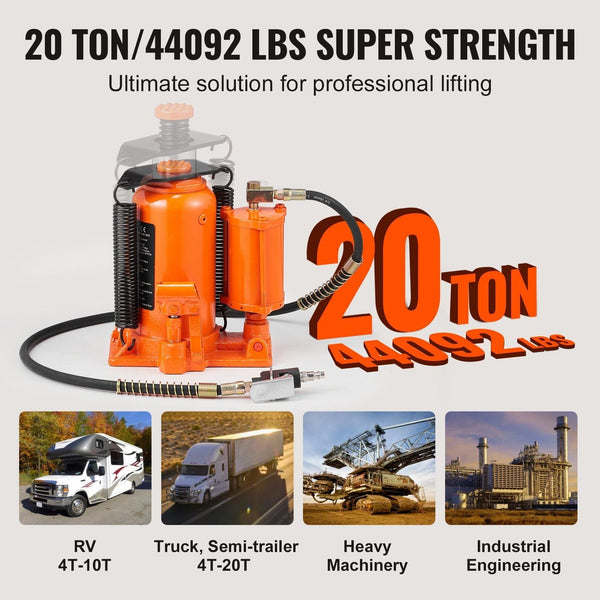 Air/Hydraulic Bottle Jack: This professional-grade air hydraulic bottle jack combines a lifting capacity of 20 tons/44, 092 lbs, providing efficient and labor-saving assistance for a wide range of lifting tasks. From heavy machinery and engineering construction to large trucks, it effortlessly handles heavy loads with ease.
