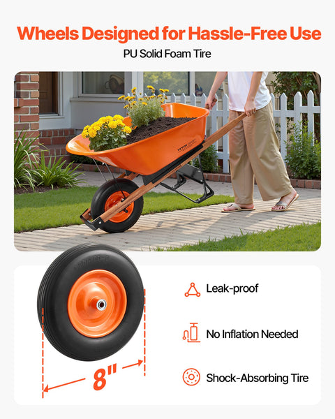 VEVOR Wheelbarrow Cart, 6 Cu. Ft. Load & 330 lbs Capacity, One Wheel Garden Dump Cart Wheel Barrow with Metal Handle & 16" Wide Track Wheels, Easy Loading Utility Yard Cart & Wagons for Lawn Farm<br/>Gardening Helper<br/>Easy to Use<br/>Durable Construction<br/>Simple Assembly<br/>Versatile Use<br/>Easy to Clean<br/>Tire Size: φ16x4'',Color: Orange + Black,Maximum Load Capacity: 330 lbs/150 kg,Product Model: WB-007A,Cart Bed Dimensions: 38.39 x 25.59 x 11.81 in / 97.5 x 65 x 30 cm,Product Dimensions: 54.72 x 25.59 x 27.56 in / 139 x 65 x 70 cm,Net Weight: 36.6 lbs/16.6 kg,Main Material: Iron + PU (Solid Foam Wheel)